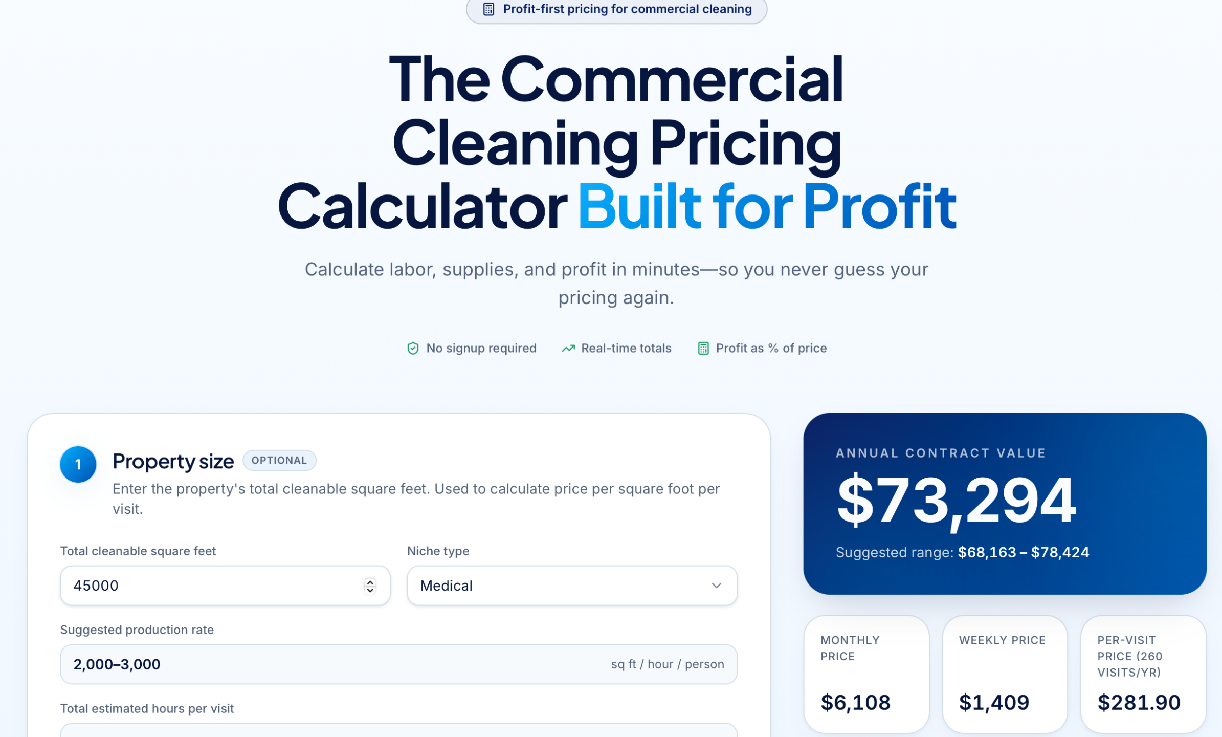 Finally, a calculator built exclusively for commercial cleaning companies that shows you exactly what to charge—before you send the quote.Â